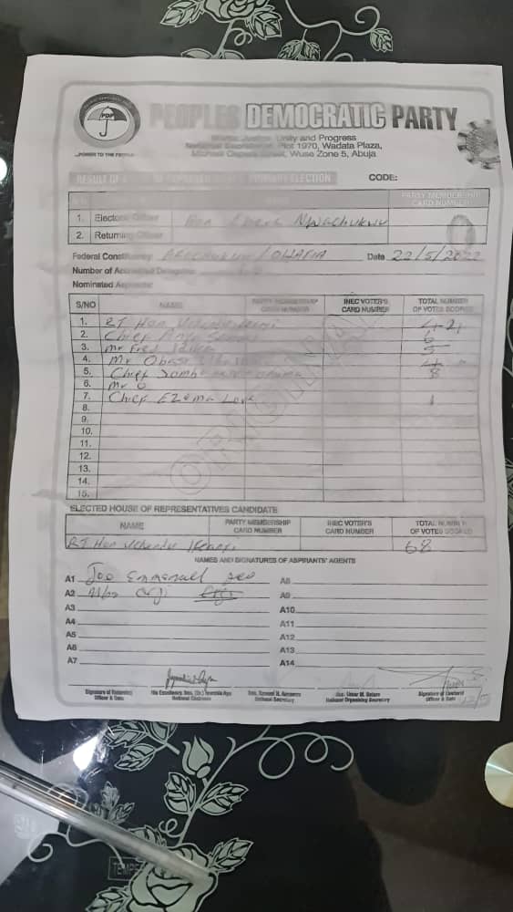 The Result attached below is the outcome of the Arochukwu/Ohafia Federal Constituency Primary election held on the 22nd of may 2022, inline with PDP guidelines and supervision and monitored INEC, it was adjudged to be very peaceful and orderly and a winner emerged in the person of Rt. Hon. Francis Ifeanyi Uchendu, I want to congratulate the winner while urging those who lost the election to take it in good fate and wait for another time.