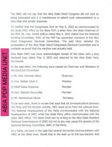 To confirm that the Congresses held on May 6, 2022 as communicated to the State INEC office the State PDP, a letter from the State Chairman of the PDP, Rt. Hon. Alwell Asiforo dated May 4, 2022 stated that the National Working Committee, NWC of the PDP has appointed members of the Abia Ward Congresses Electoral Committee. The said letter detailed the composition of the Abia State Ward Congresses Electoral Committee and is available as proof that the election was actually held.