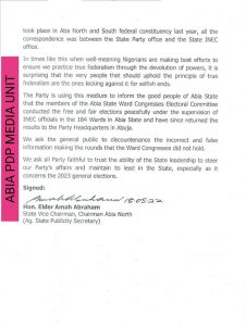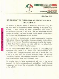 The attention of the Abia chapter of the People’s Democratic Party, PDP has been drawn to mischievous reports circulating in the social media including a press release some governorship and House of Representatives aspirants in Abia State, that the Independent National Electoral Commission, INEC has confirmed through a legal correspondence that the three-man delegates election did not hold.